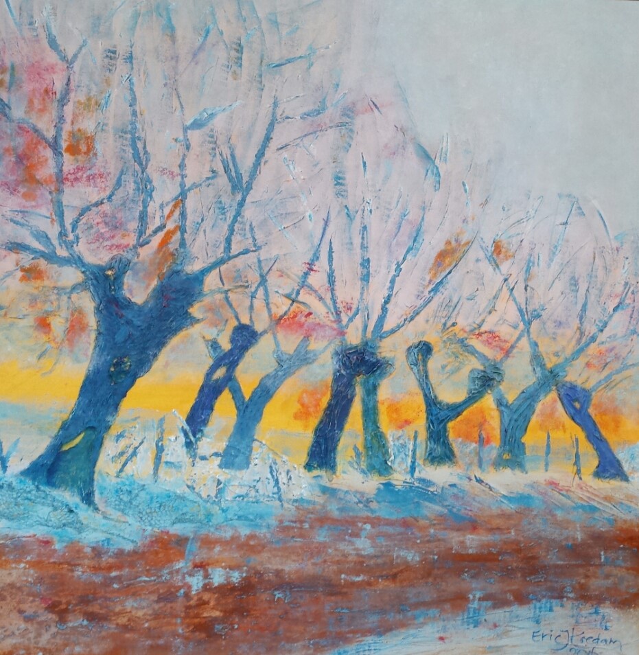 Ik wilde iets moois boven de bank met blauw als hoofdkleur, gerelateerd aan de natuur. Eric schilderde voor mij deze knotwilgen in een winters landschap bij zonsopgang, met hier en daar nog mist op het land. Ik geniet elke dag van dit uitzicht boven mijn bank!