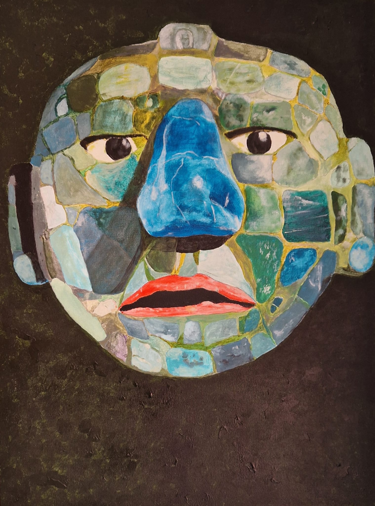 Esta máscara de cadera maya en realidad no es más grande que una mano y se usaba como adorno. Lo que me gusta de esta máscara son las piedras preciosas turquesas que tiene incorporadas. También era un color que sólo podía usar la élite, especialmente la familia real. Para mí fue un reto transmitir esas piedras preciosas lo más brillantes posible.